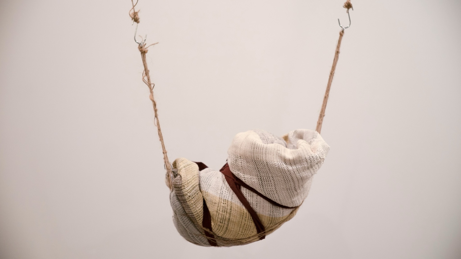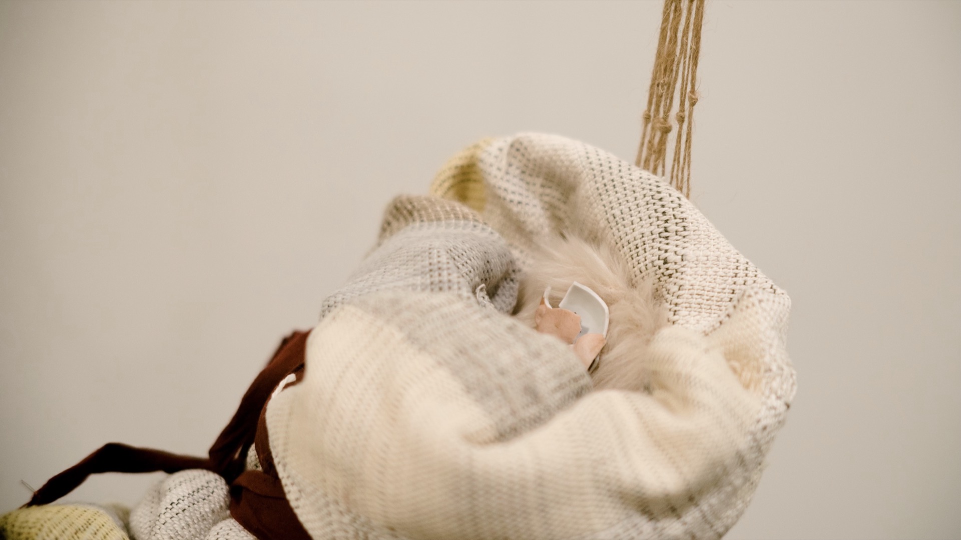 At the center of this work is the “baby”, an infant-sized object weighing about 8 pounds. Its head is disproportionally small and the body wrapped tightly in a handwoven baby blanket. As the “baby” gets passed around among attendees in the exhibition, each temporary caregiver can decide what to do with the “baby” when it is handed to them. When the “baby” is left unattended, it will cry nonstop. When the “baby” is held by a pair of human hands, the crying will become softer. When the “baby” is actively attended to and gently rocked, the crying will stop. When fully attended to, the “baby” may say a few words.