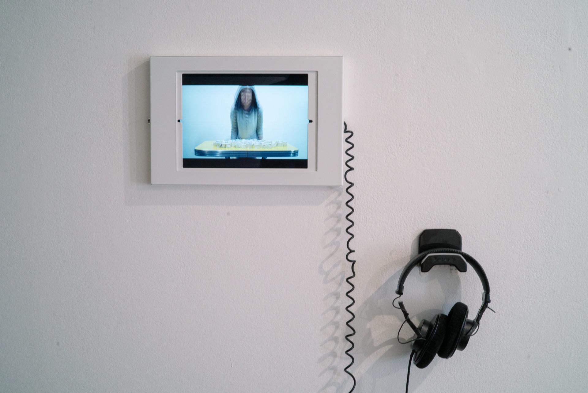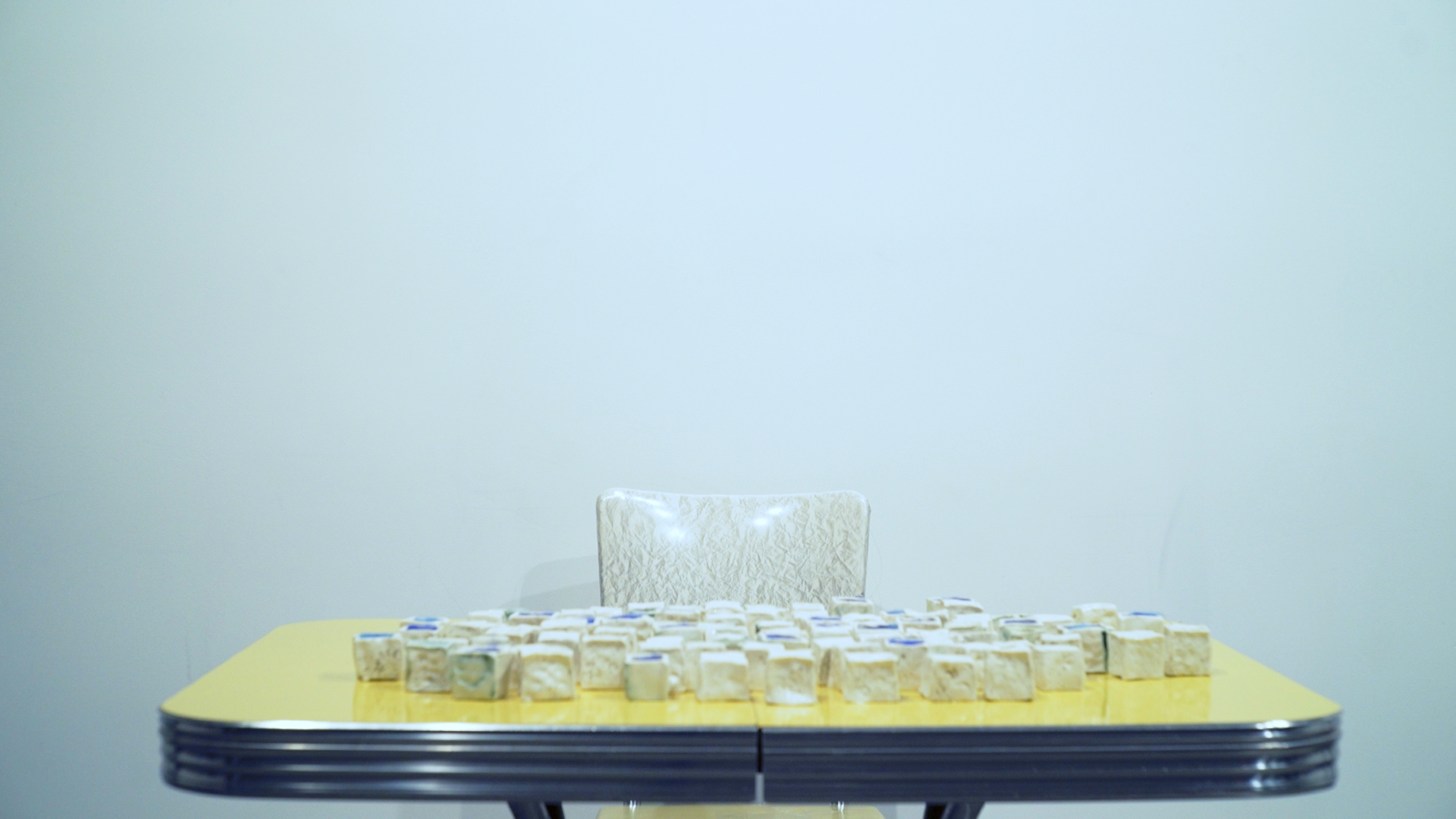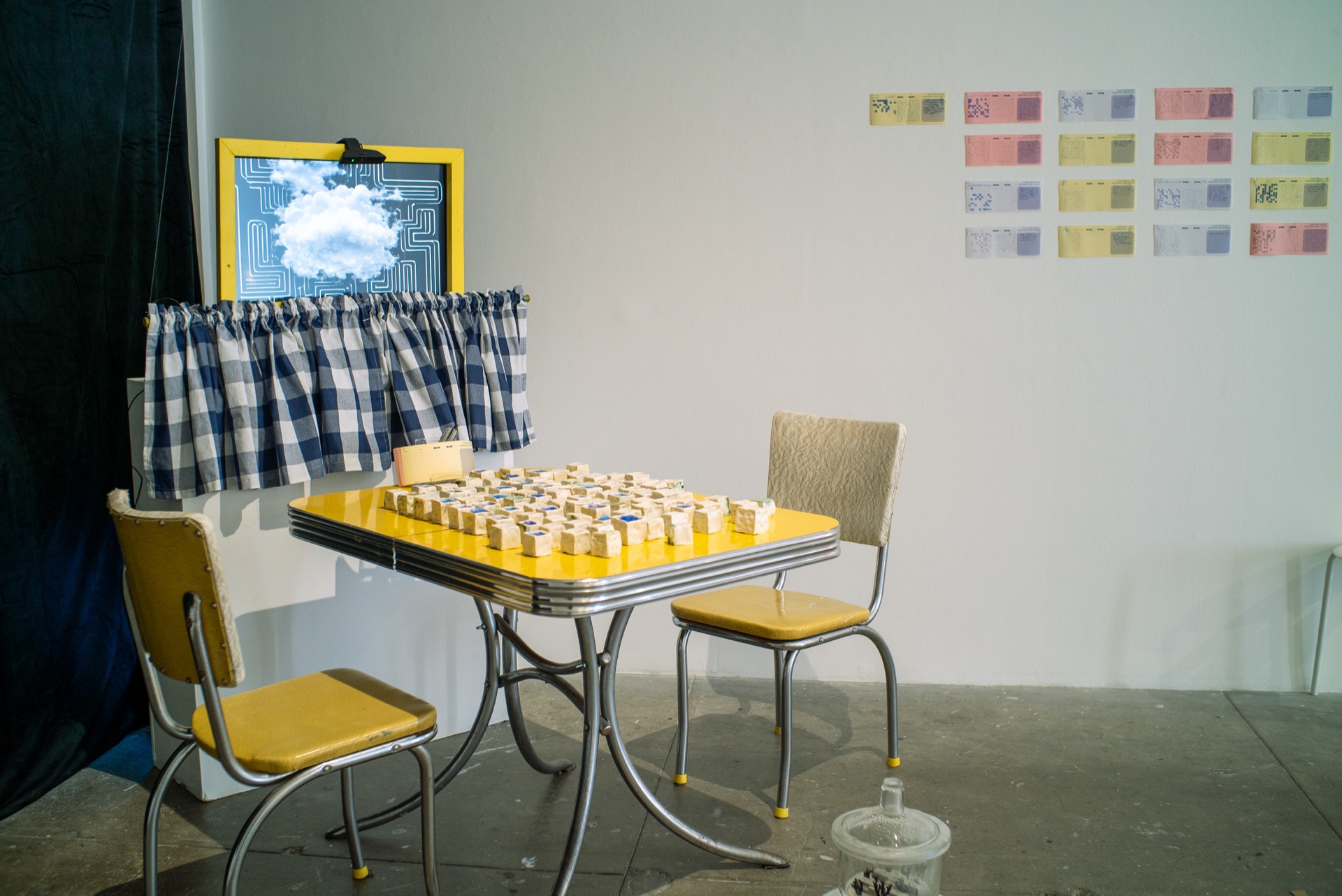 Teach The Machine Something About Cloud (2024) is an interactive installation exploring data, perception, and human-machine interaction. Set at SOIL Artist Run Gallery in Seattle, it invites viewers to engage with a vintage yellow table covered in one-inch ceramic cubes, each containing soft blue silk fibers that resemble fog. Above the table, a yellow window frame displays a generative cloud animation, subtly influenced by the arrangement of the cubes below, with a webcam quietly watching.