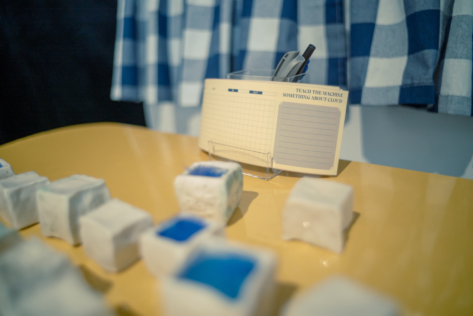 The installation uses an AI-driven cloud simulation, responding to shapes and colors detected by the webcam. Viewers can interact by following a guided four-step process: flipping and arranging the cubes to create patterns, translating these onto a 9x10 grid, converting the grid into binary code, and pairing it with a written thought on “clouds.” Through this sequence, participants contribute to an arbitary dataset.